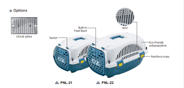PNL-21 and PNL-22 are high-quality PET plastic carriers designed for efficient storage and transport. Made from eco-friendly polypropylene, they feature built-in food bowls, switches, and ventilation holes. Available in two sizes (L521×W340×H330mm and L600×W400×H425mm), they offer customized options for enhanced convenience.